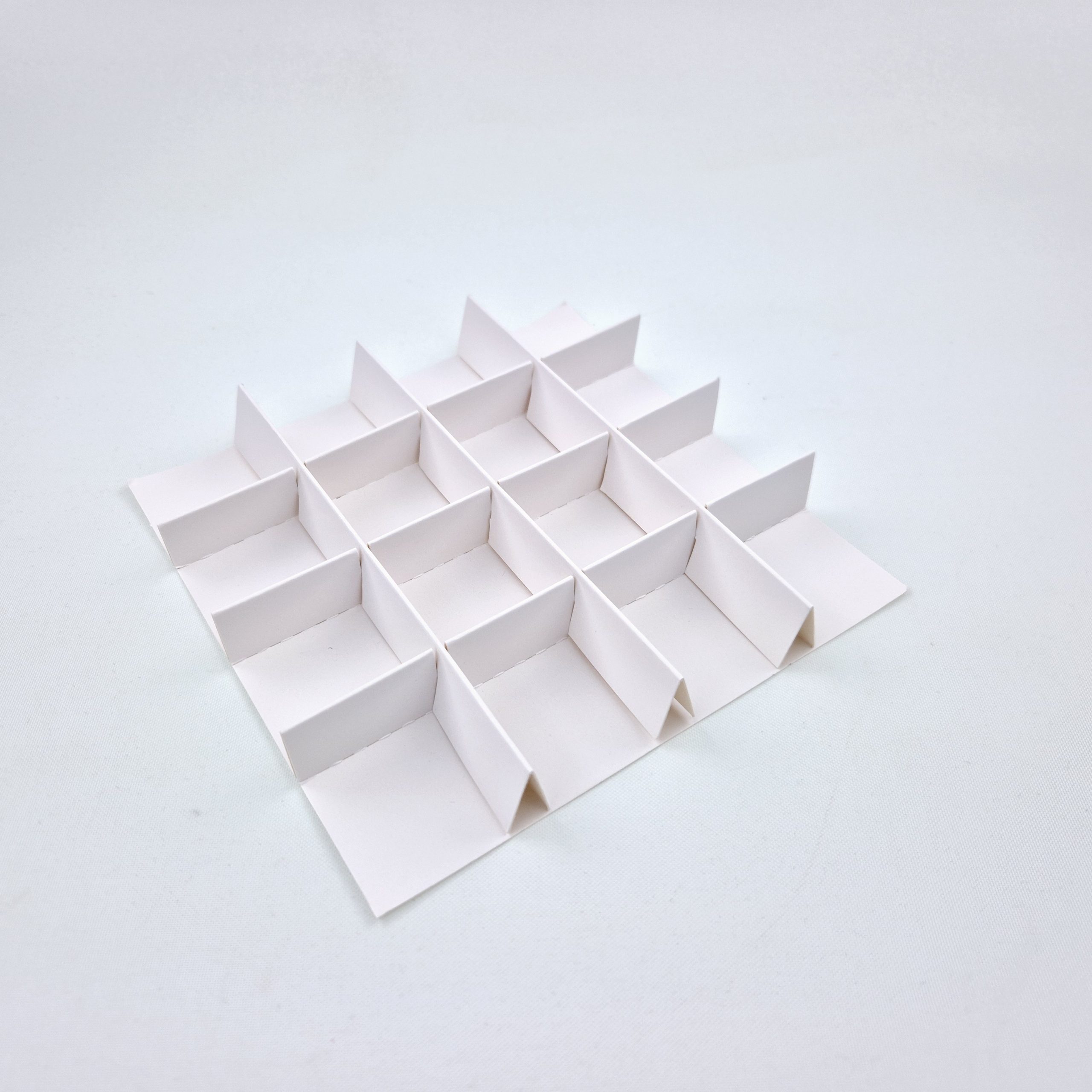 Kratownicą zapobiega przemieszczaniu się produktów umieszczonych wewnątrz, przekładki dzielą pudełko na 16 równych części.