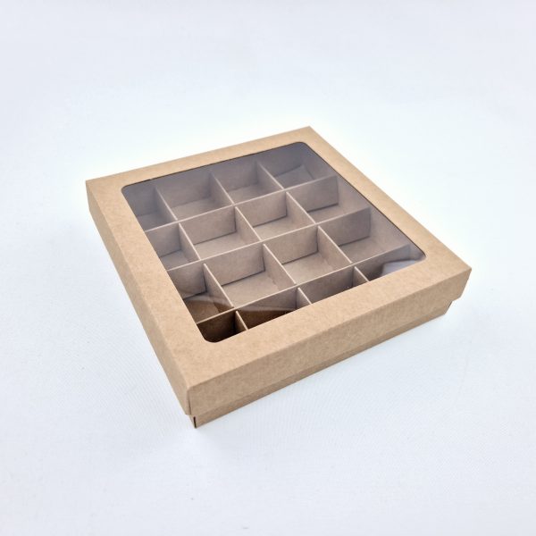 Kratownicą zapobiega przemieszczaniu się produktów umieszczonych wewnątrz, przekładki dzielą pudełko na 16 równych części.