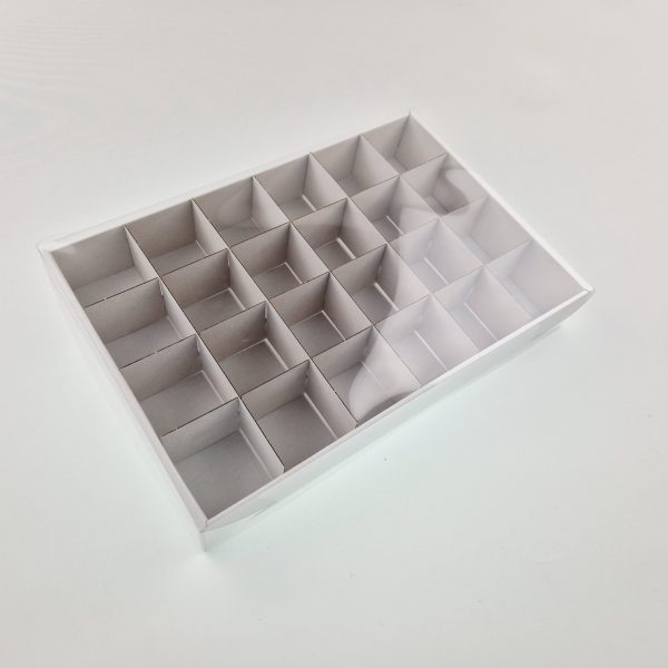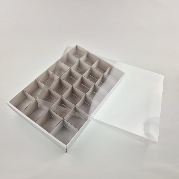 Ozdobne pudełko o wymiarach 38 cm x 26 cm x 6 cm z foliową pokrywką, wykonane z mikrofali w kolorze białym.