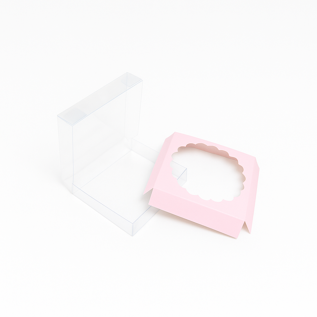 Pudełko wykonane z twardej przeźroczystej folii z ozdobną wkładką o wymiarach 9,5×9,5×2