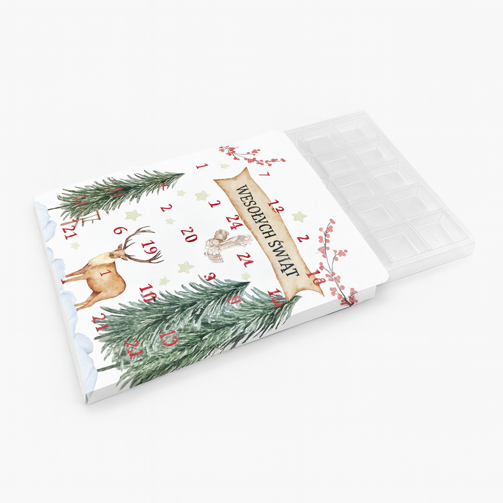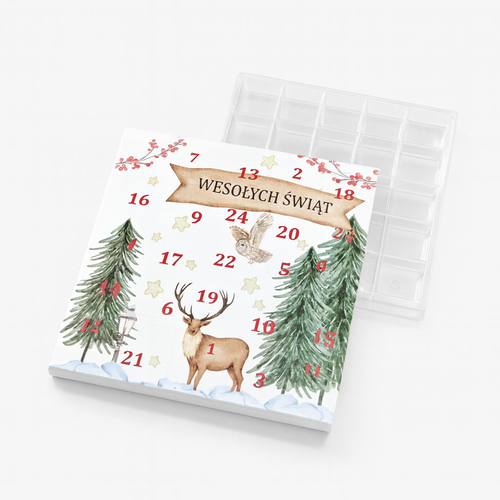 Pudełko posiada 25 otwieranych okienek o wymiarach 4,5 cm x 4,5 cm