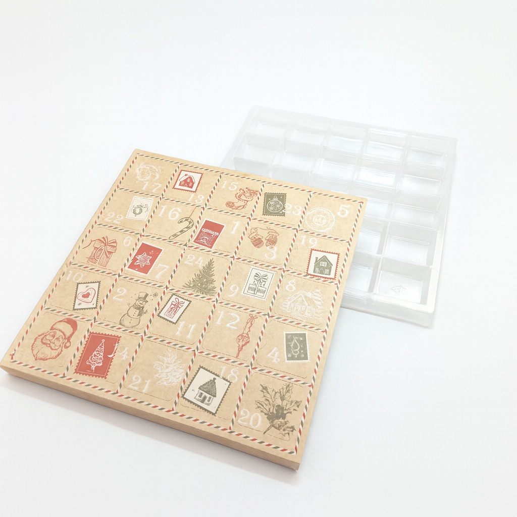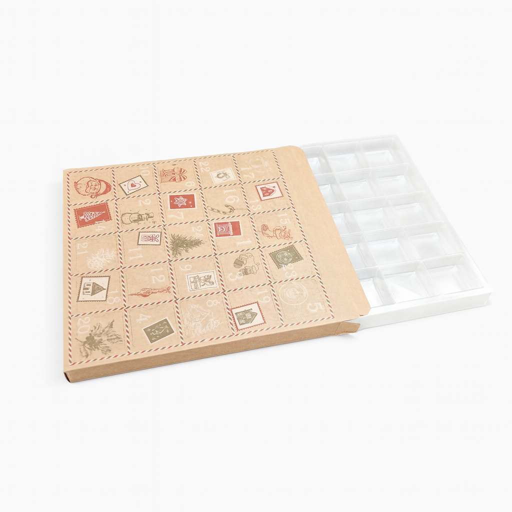 Eleganckie pudełko – kalendarz do którego włożysz samodzielnie przygotowane czekoladki, trufle, pralinki lub inne drobiazgi. Idealne na prezent.