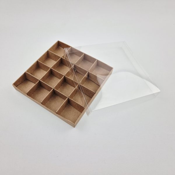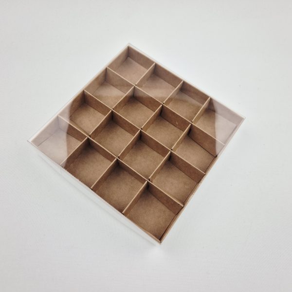 Ozdobne pudełko z przeźroczystą foliową pokrywką, wykonane z eleganckiego kartonu w kolorze naturalnym o wymiarach 15x15x2 cm.