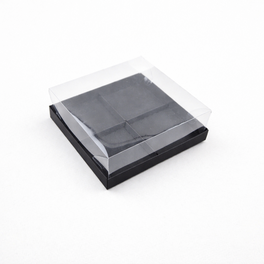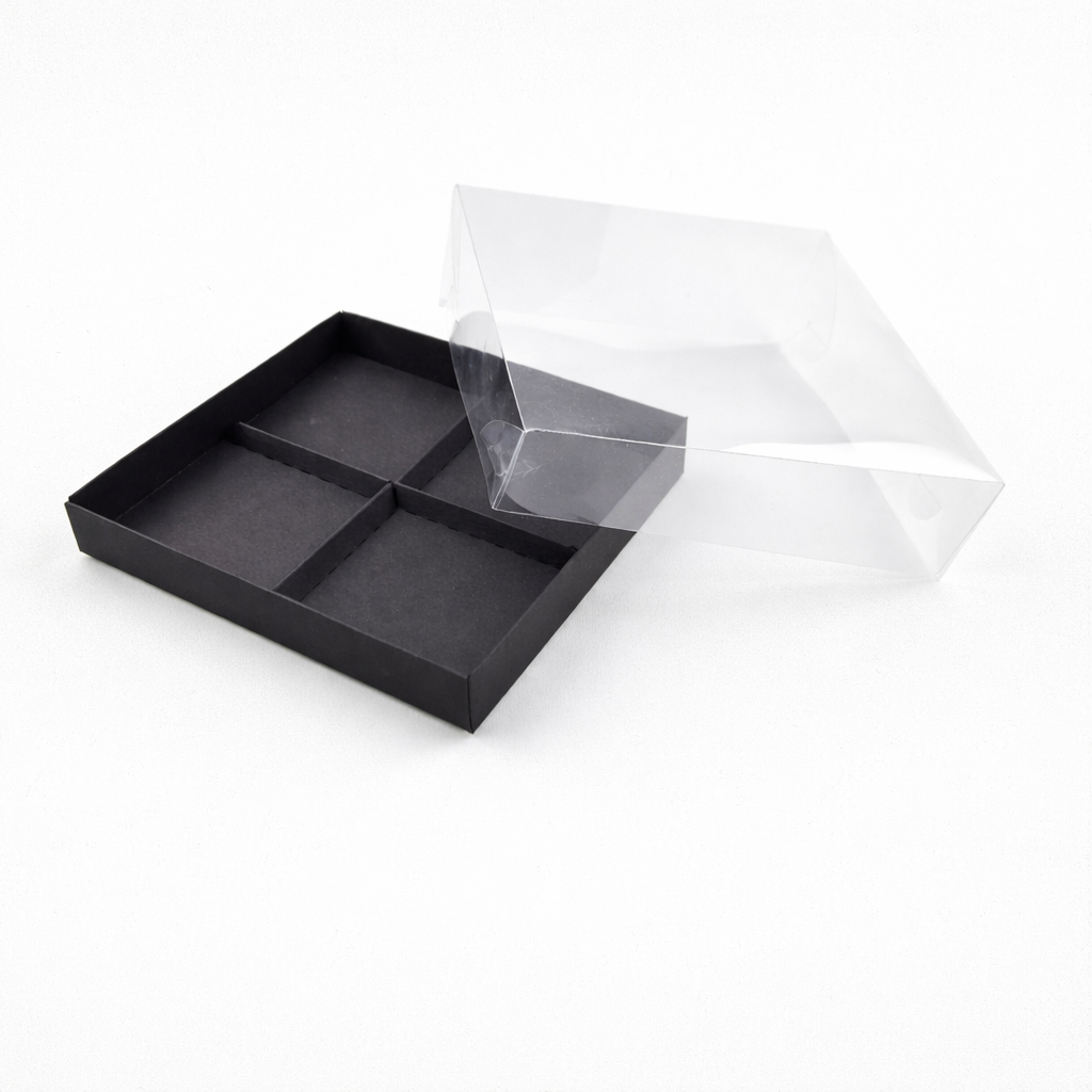 Pudełko  na monoporcje   4 szt wykonane z eleganckiego ozdobnego kartonu w kolorze czarnym z wysokiej jakości foliową pokrywką PET.