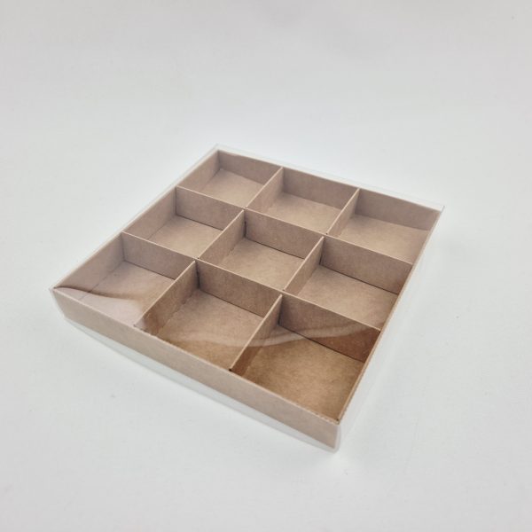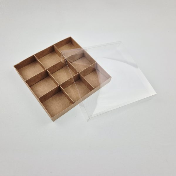 Ozdobne pudełko z przeźroczystą foliową pokrywką, wykonane z eleganckiego kartonu w kolorze naturalnym o wymiarach 15x15x2 cm.