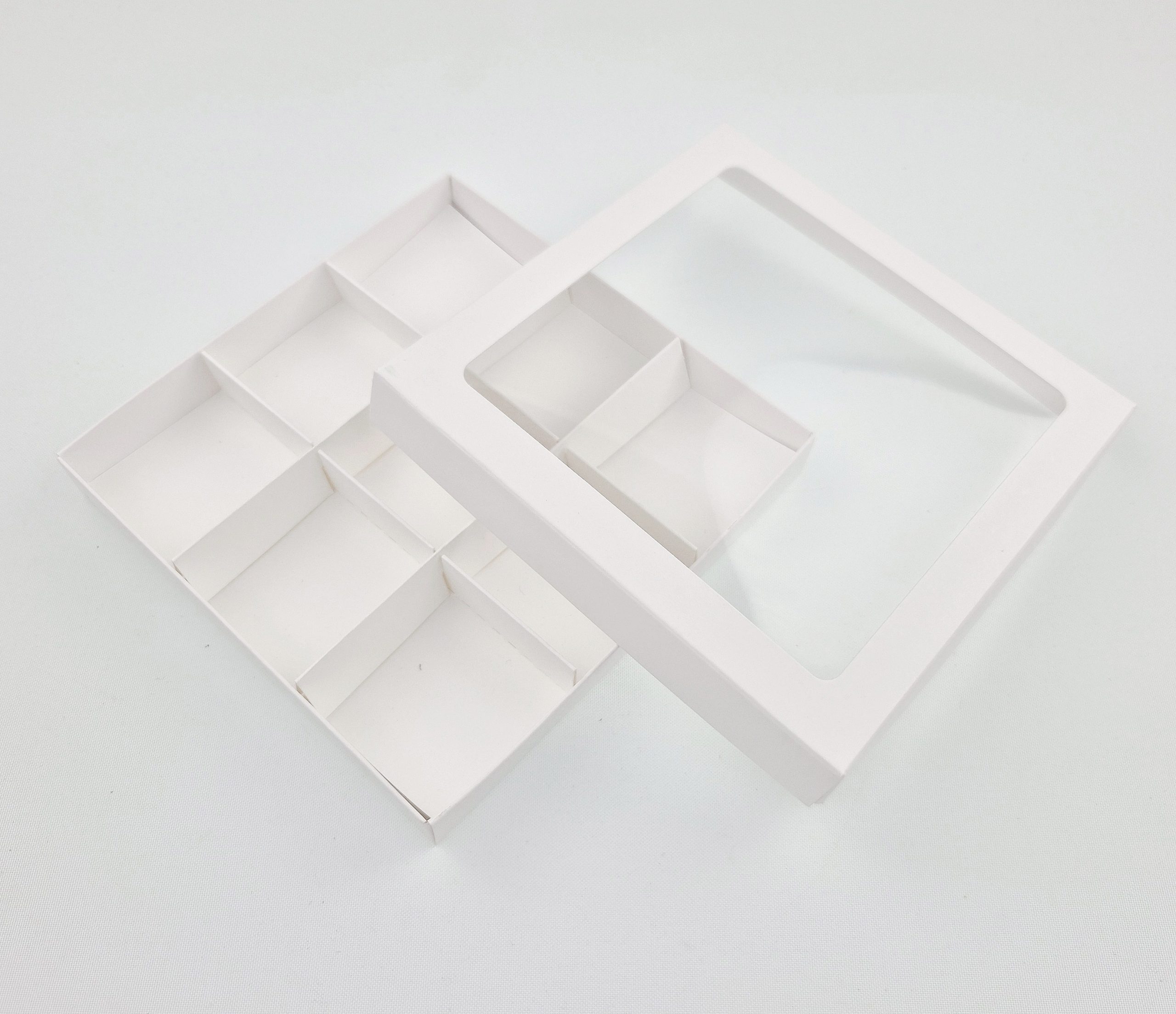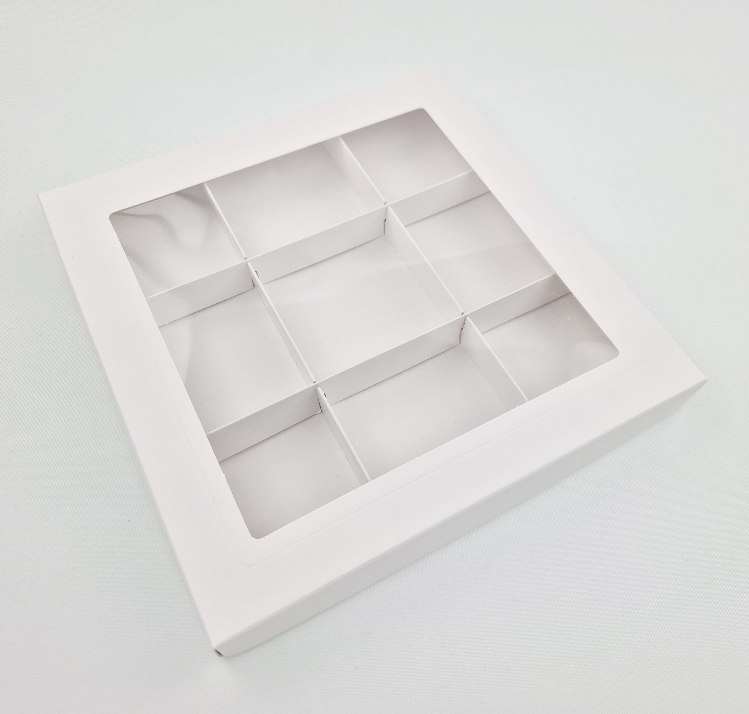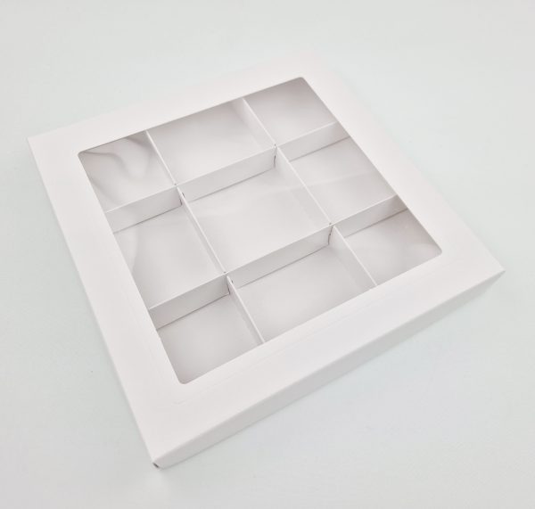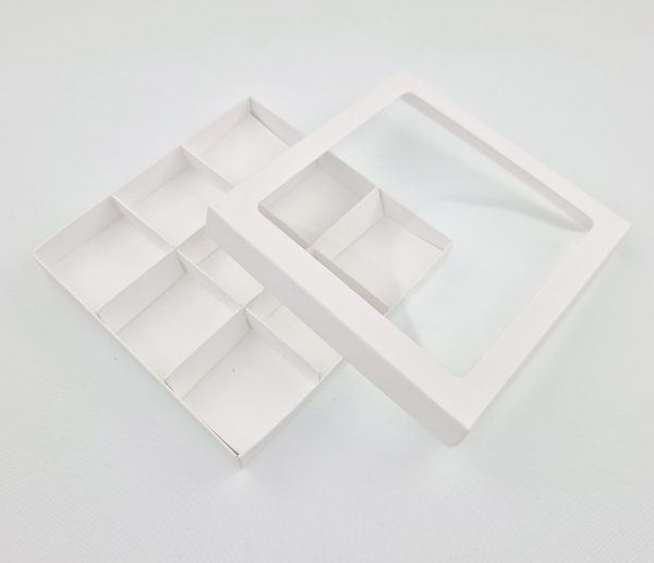 Ozdobne pudełko z wklejonym foliowym okienkiem, wykonane z eleganckiego kartonu w kolorze białym o wymiarach 15 x 15 x 2 cm.