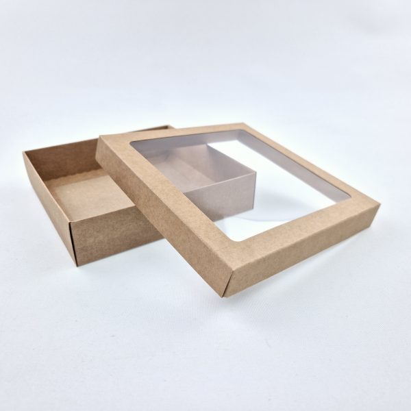 Ozdobne pudełko z wklejonym foliowym okienkiem, wykonane z eleganckiego kartonu w kolorze naturalnym o wymiarach 15x15x3,5 cm.