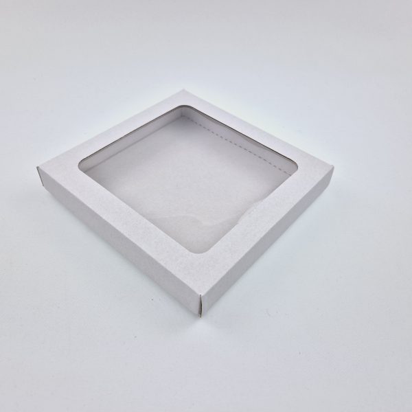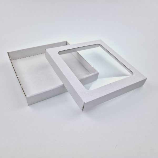 Pudełko o wymiarach 17 cm x 17 cm x 2,5 cm z wklejonym foliowym okienkiem.