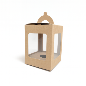 Ozdobne pudełko o wymiarach 17 cm x 17 cm x 2,5 cm z wklejonym foliowym okienkiem, wieczko wykonane z eleganckiej tektury falistej w kolorze naturalnym.