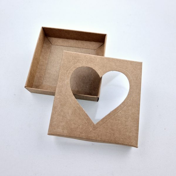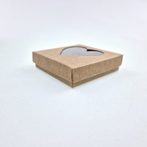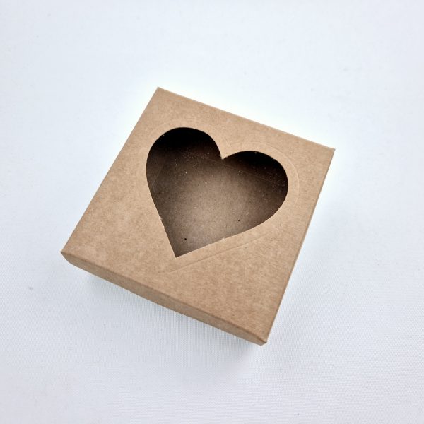 Ozdobne pudełko z okienkiem, wykonane z eleganckiego kartonu w kolorze naturalnym o wymiarach 8x8x2 cm.