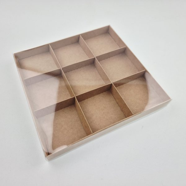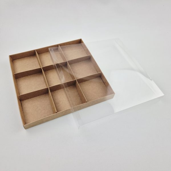 W zestawie kratownicą zapobiega przemieszczaniu się produktów umieszczonych wewnątrz, przekładki dzielą pudełko na 9 równych części.