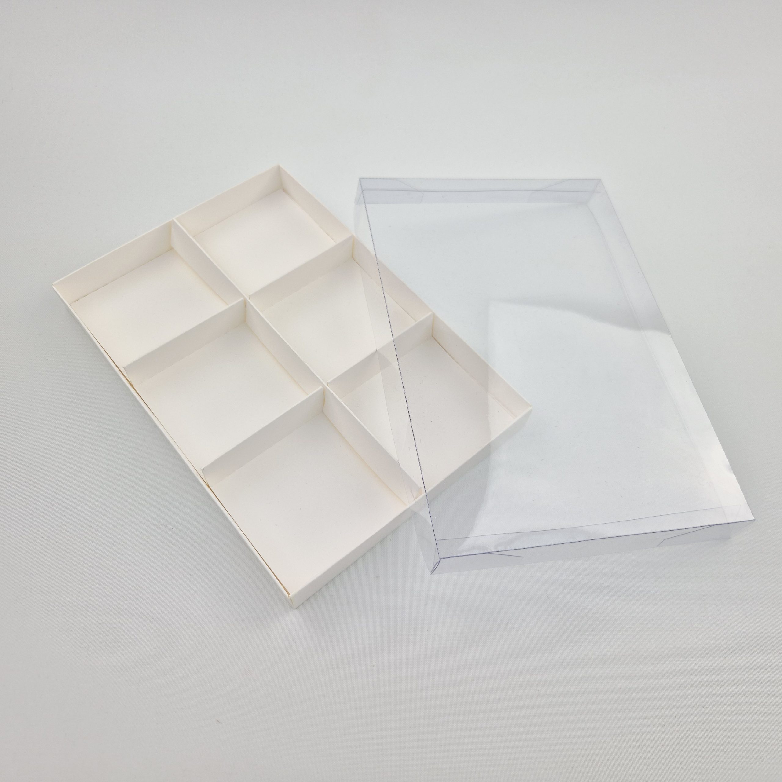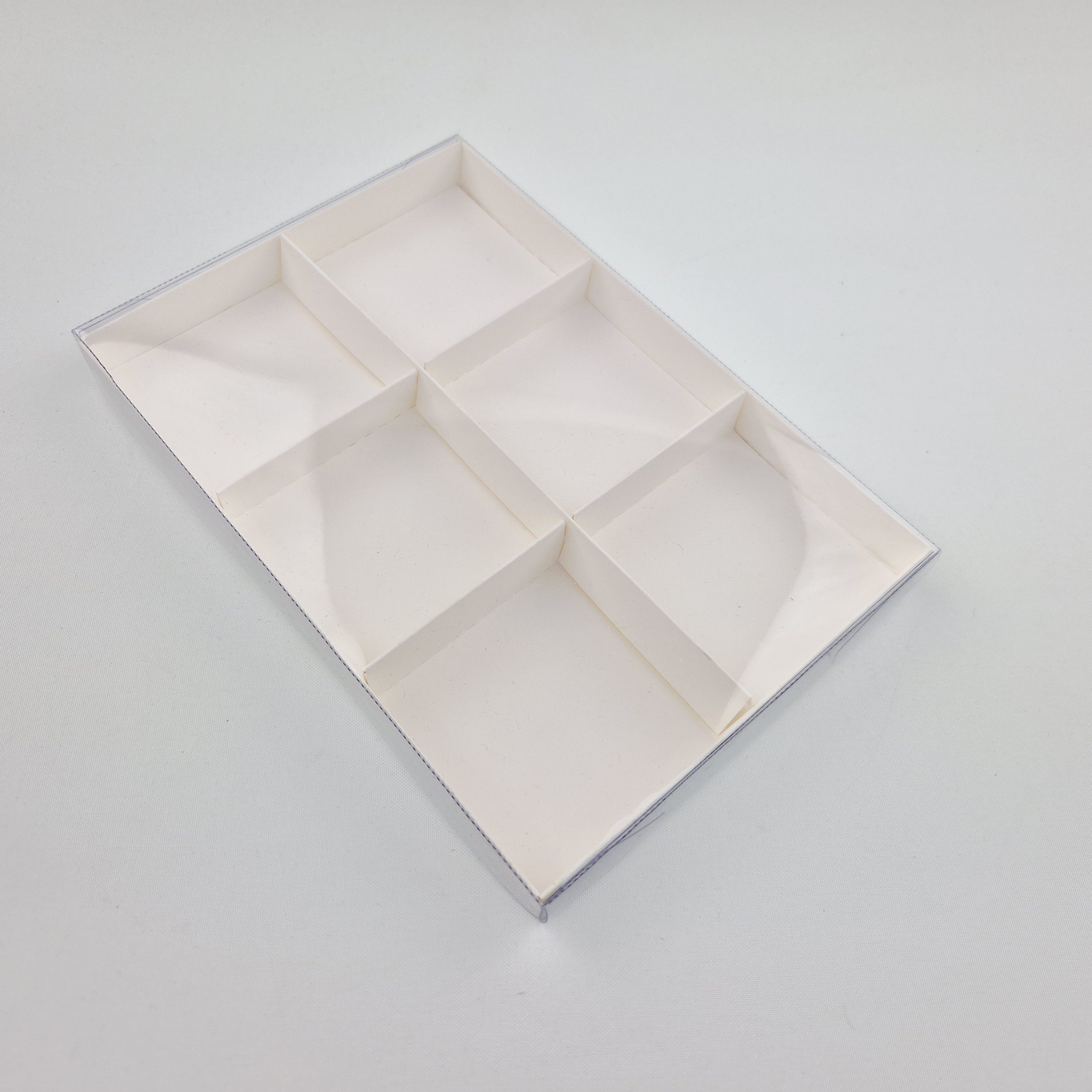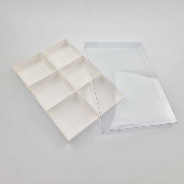 W zestawie kratownicą zapobiega przemieszczaniu się produktów umieszczonych wewnątrz, przekładki dzielą pudełko na 6 równych części.